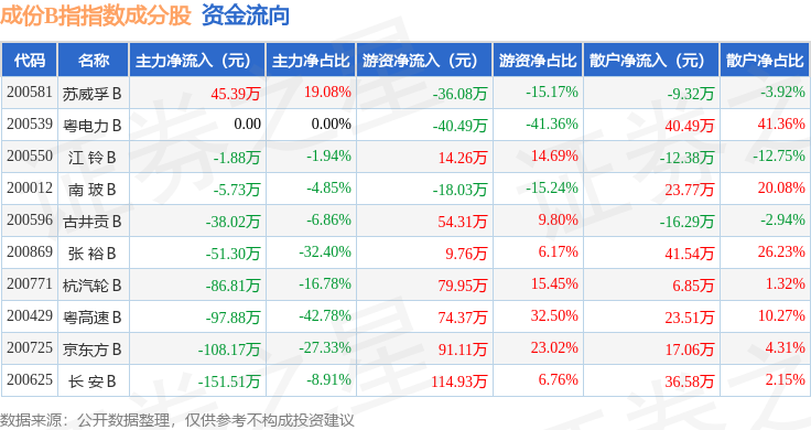 资金流向方面,成份B指(399003)指数成份股当日主力资金净流出合计495.91万元,游资资金净流入合计344.1万元,散户资金净流入合计151.81万元。成份股资金流向详情见下表: