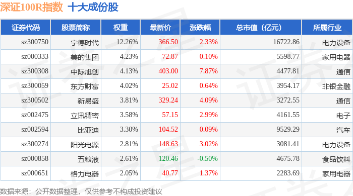 证券之星消息,10月20日,深证100R(399004)指数报收于8016.03点,涨1.07%,成交2173.77亿元,换手率1.14%。当日该指数成份股中,上涨的有57家,中际旭创以7.87%的涨幅领涨,下跌的有42家,海大集团以6.02%的跌幅领跌。