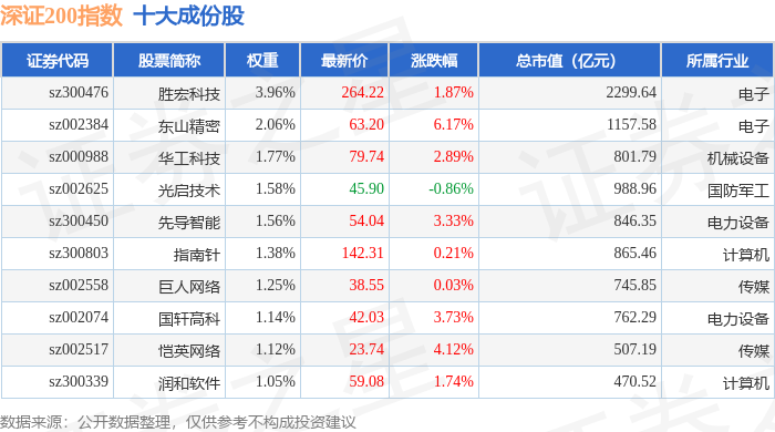 深证200(399009)指数十大成份股详情如下: