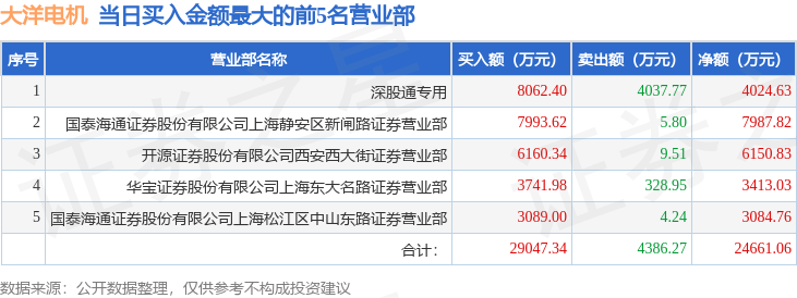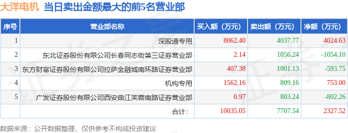 证券之星消息,沪深交易所2025年10月20日公布的交易公开信息显示,大洋电机(002249)因日涨幅偏离值达到7%的前5只证券登上龙虎榜。此次是近5个交易日内第1次上榜。