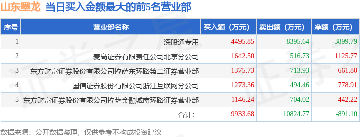证券之星消息,沪深交易所2025年10月20日公布的交易公开信息显示,山东墨龙(002490)因日换手率达到20%的前5只证券登上龙虎榜。此次是近5个交易日内第1次上榜。