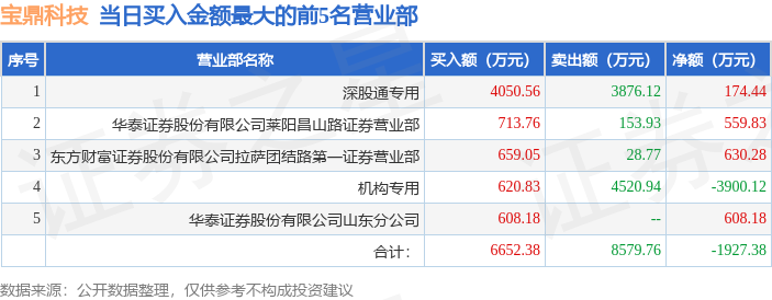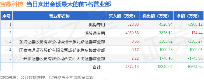 证券之星消息,沪深交易所2025年10月20日公布的交易公开信息显示,宝鼎科技(002552)因日跌幅偏离值达到7%的前5只证券登上龙虎榜。此次是近5个交易日内第1次上榜。