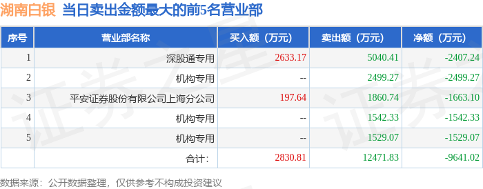 证券之星消息,沪深交易所2025年10月20日公布的交易公开信息显示,湖南白银(002716)因日跌幅偏离值达到7%的前5只证券登上龙虎榜。此次是近5个交易日内第1次上榜。