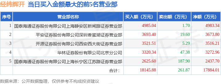 证券之星消息,沪深交易所2025年10月20日公布的交易公开信息显示,经纬辉开(300120)因日涨幅达到15%的前5只证券登上龙虎榜。此次是近5个交易日内第1次上榜。