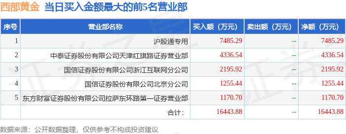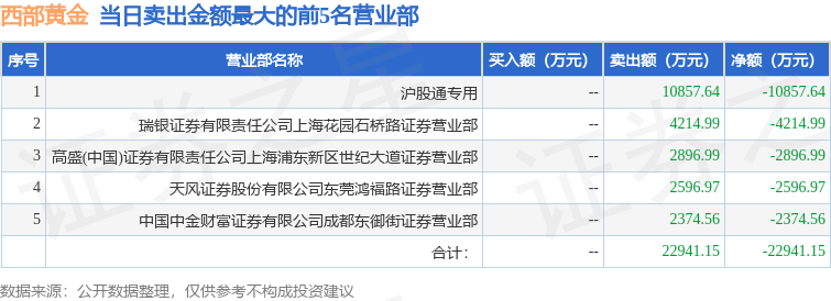 证券之星消息,沪深交易所2025年10月20日公布的交易公开信息显示,西部黄金(601069)因有价格涨跌幅限制的日收盘价格跌幅偏离值达到7%的前五只证券登上龙虎榜。此次是近5个交易日内第1次上榜。