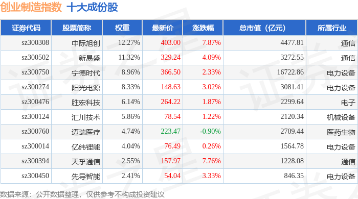 证券之星消息,10月20日,创业制造(399261)指数报收于5573.04点,涨2.64%,成交1418.29亿元,换手率2.73%。当日该指数成份股中,上涨的有38家,中际旭创以7.87%的涨幅领涨,下跌的有12家,英科医疗以2.21%的跌幅领跌。