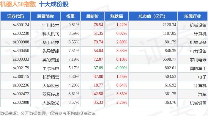 证券之星消息,10月20日,机器人50(399283)指数报收于4269.4点,涨1.45%,成交369.69亿元,换手率2.27%。当日该指数成份股中,上涨的有44家,星网宇达以10.01%的涨幅领涨,下跌的有5家,东方精工以1.45%的跌幅领跌。