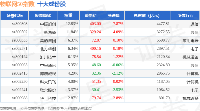 证券之星消息,10月20日,物联网50(399285)指数报收于5662.87点,涨1.78%,成交1160.49亿元,换手率2.77%。当日该指数成份股中,上涨的有40家,中际旭创以7.87%的涨幅领涨,下跌的有10家,歌尔股份以2.53%的跌幅领跌。