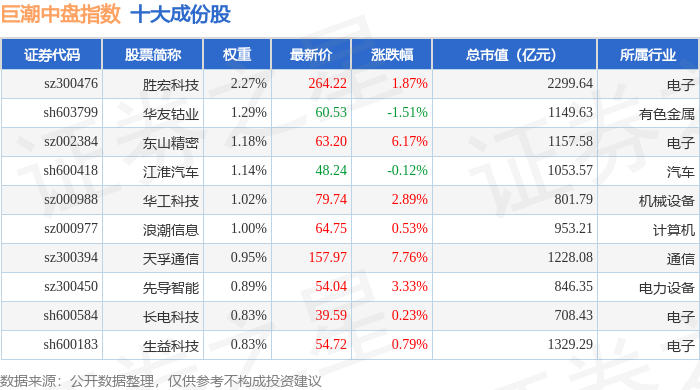 证券之星消息,10月20日,巨潮中盘(399315)指数报收于4519.08点,涨0.69%,成交2554.03亿元,换手率1.46%。当日该指数成份股中,上涨的有174家,士兰微以8.65%的涨幅领涨,下跌的有115家,赤峰黄金以6.84%的跌幅领跌。