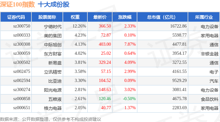 深证100(399330)指数十大成份股详情如下: