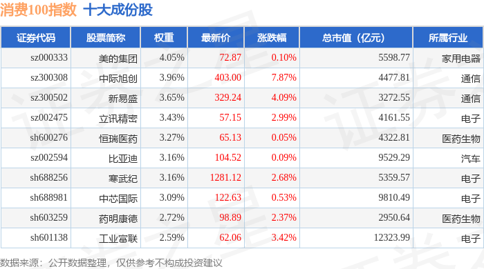 证券之星消息,10月20日,消费100(399364)指数报收于10576.66点,涨1.16%,成交2651.72亿元,换手率1.34%。当日该指数成份股中,上涨的有65家,中际旭创以7.87%的涨幅领涨,下跌的有33家,海大集团以6.02%的跌幅领跌。