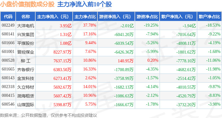 资金流向方面,小盘价值(399377)指数成份股当日主力资金净流入合计1.23亿元,游资资金净流出合计3.87亿元,散户资金净流入合计2.64亿元。成份股资金流向详情见下表: