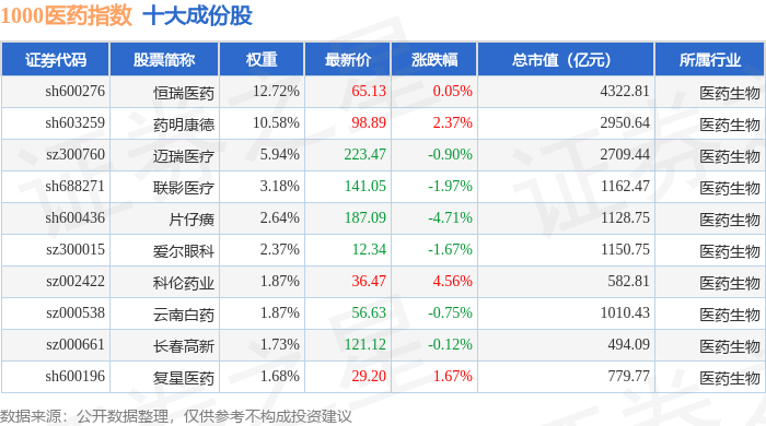 证券之星消息,10月20日,1000医药(399386)指数报收于6196.52点,涨0.15%,成交324.99亿元,换手率0.9%。当日该指数成份股中,上涨的有46家,大参林以5.09%的涨幅领涨,下跌的有43家,片仔癀以4.71%的跌幅领跌。