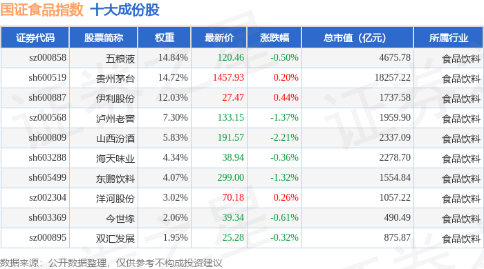 证券之星消息,10月20日,国证食品(399396)指数报收于18610.8点,跌0.37%,成交172.95亿元,换手率0.69%。当日该指数成份股中,上涨的有17家,养元饮品以3.38%的涨幅领涨,下跌的有32家,盐津铺子以4.66%的跌幅领跌。