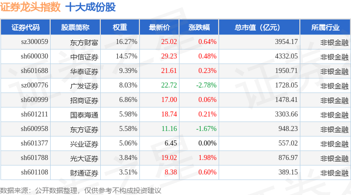 证券之星消息,10月20日,证券龙头(399437)指数报收于6907.47点,跌0.07%,成交288.99亿元,换手率0.93%。当日该指数成份股中,上涨的有16家,光大证券以1.98%的涨幅领涨,下跌的有11家,广发证券以2.78%的跌幅领跌。