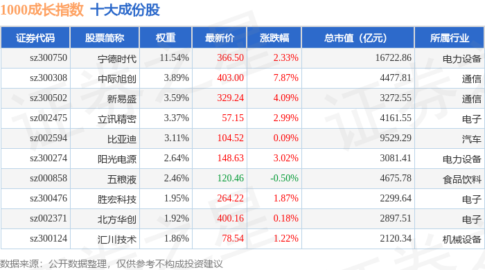 1000成长(399630)指数十大成份股详情如下: