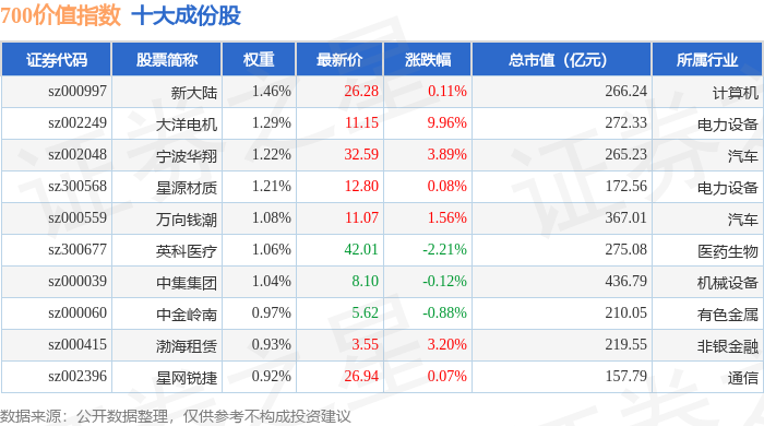 证券之星消息,10月20日,700价值(399629)指数报收于2827.81点,涨0.67%,成交541.13亿元,换手率2.07%。当日该指数成份股中,上涨的有154家,电广传媒以10.06%的涨幅领涨,下跌的有71家,恒邦股份以6.63%的跌幅领跌。