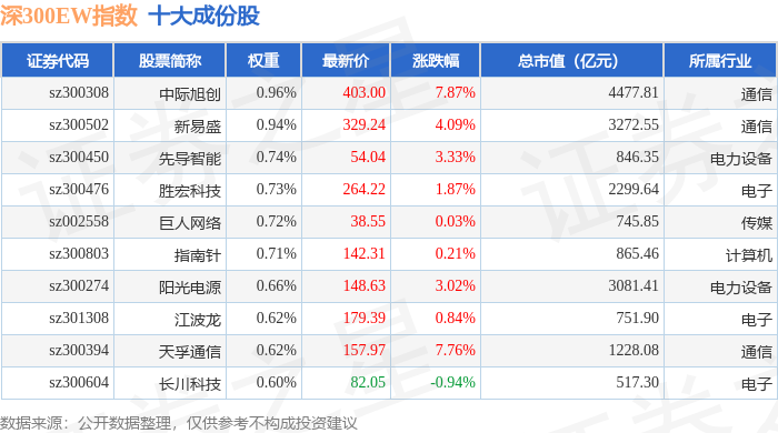 证券之星消息,10月20日,深300EW(399633)指数报收于5905.54点,涨0.75%,成交3877.93亿元,换手率1.41%。当日该指数成份股中,上涨的有186家,中际旭创以7.87%的涨幅领涨,下跌的有106家,海大集团以6.02%的跌幅领跌。
