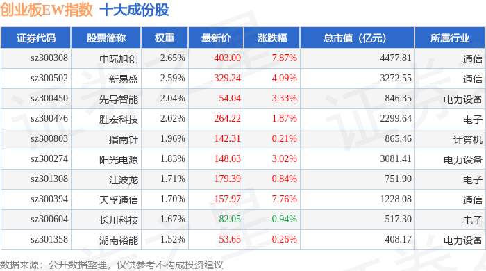 创业板EW(399635)指数十大成份股详情如下: