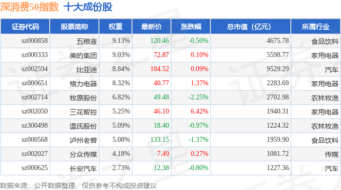 证券之星消息,10月20日,深消费50(399646)指数报收于8069.48点,涨0.11%,成交431.68亿元,换手率1.35%。当日该指数成份股中,上涨的有28家,三花智控以6.42%的涨幅领涨,下跌的有20家,海大集团以6.02%的跌幅领跌。