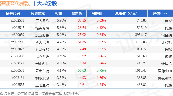 资金流向方面,深证文化(399654)指数成份股当日主力资金净流出合计3.88亿元,游资资金净流出合计2.9亿元,散户资金净流入合计6.77亿元。成份股资金流向详情见下表: