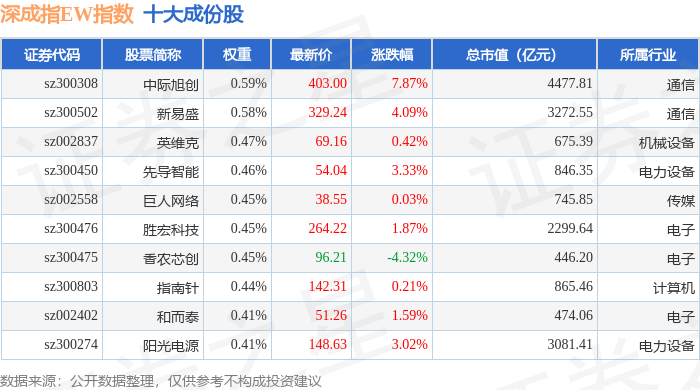 深成指EW(399659)指数十大成份股详情如下: