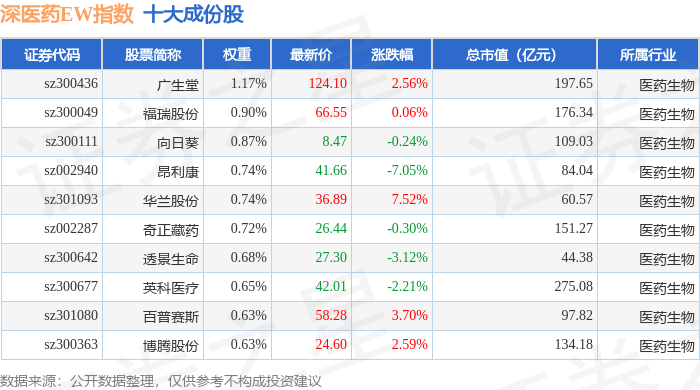 证券之星消息,10月20日,深医药EW(399676)指数报收于3820.0点,涨0.82%,成交465.43亿元,换手率2.05%。当日该指数成份股中,上涨的有160家,我武生物以10.07%的涨幅领涨,下跌的有57家,昂利康以7.05%的跌幅领跌。
