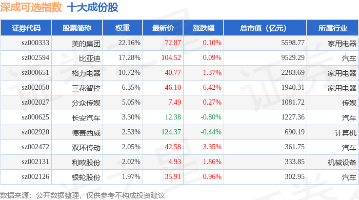 证券之星消息,10月20日,深成可选(399683)指数报收于1884.06点,涨0.96%,成交393.34亿元,换手率1.74%。当日该指数成份股中,上涨的有34家,三花智控以6.42%的涨幅领涨,下跌的有10家,周大生以1.72%的跌幅领跌。