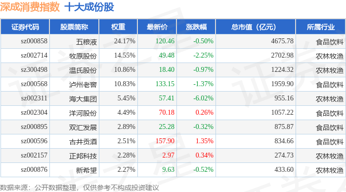 证券之星消息,10月20日,深成消费(399684)指数报收于1934.33点,跌1.11%,成交110.82亿元,换手率0.78%。当日该指数成份股中,上涨的有7家,古井贡酒以1.35%的涨幅领涨,下跌的有18家,海大集团以6.02%的跌幅领跌。