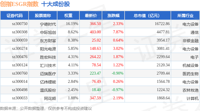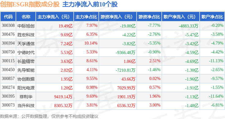 资金流向方面,创指ESGR(470028)指数成份股当日主力资金净流入合计28.95亿元,游资资金净流出合计25.78亿元,散户资金净流出合计3.17亿元。成份股资金流向详情见下表: