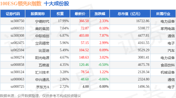 证券之星消息,10月20日,100ESG领先R(470030)指数报收于8896.45点,涨1.22%,成交1386.02亿元,换手率1.25%。当日该指数成份股中,上涨的有27家,中际旭创以7.87%的涨幅领涨,下跌的有22家,歌尔股份以2.53%的跌幅领跌。