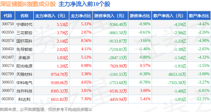 资金流向方面,深证储能R(470036)指数成份股当日主力资金净流出合计1.85亿元,游资资金净流出合计2.96亿元,散户资金净流入合计4.81亿元。成份股资金流向详情见下表: