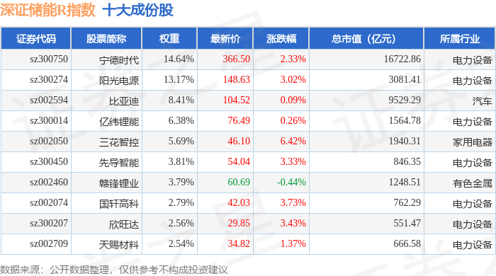 证券之星消息,10月20日,深证储能R(470036)指数报收于11078.9点,涨1.98%,成交951.53亿元,换手率3.9%。当日该指数成份股中,上涨的有41家,三花智控以6.42%的涨幅领涨,下跌的有8家,中恒电气以2.52%的跌幅领跌。
