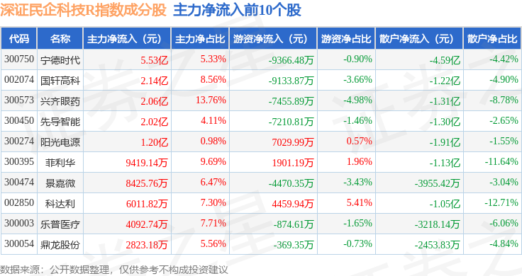 资金流向方面,深证民企科技R(470059)指数成份股当日主力资金净流出合计7.19亿元,游资资金净流入合计3.4亿元,散户资金净流入合计3.78亿元。成份股资金流向详情见下表: