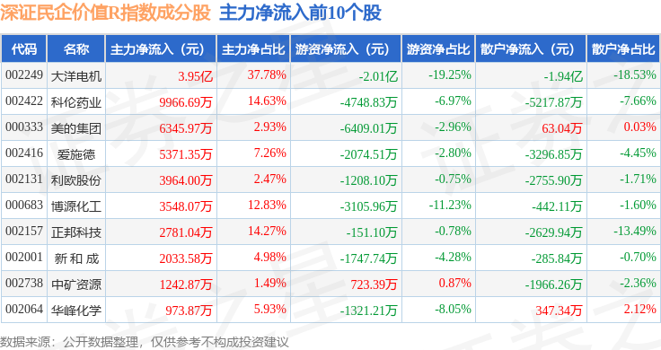 资金流向方面,深证民企价值R(470072)指数成份股当日主力资金净流出合计8.71亿元,游资资金净流出合计1.73亿元,散户资金净流入合计10.44亿元。成份股资金流向详情见下表: