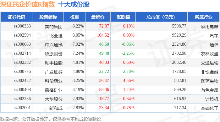 深证民企价值R(470072)指数十大成份股详情如下: