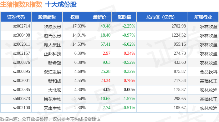 证券之星消息,10月20日,生猪指数R(480073)指数报收于3564.55点,跌1.46%,成交90.38亿元,换手率1.18%。当日该指数成份股中,上涨的有20家,罗牛山以1.96%的涨幅领涨,下跌的有16家,海大集团以6.02%的跌幅领跌。