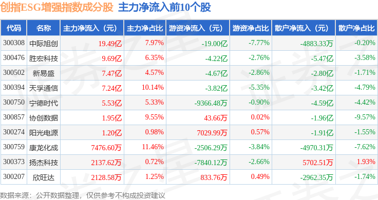 资金流向方面,创指ESG增强(970034)指数成份股当日主力资金净流入合计35.54亿元,游资资金净流出合计30.92亿元,散户资金净流出合计4.61亿元。成份股资金流向详情见下表: