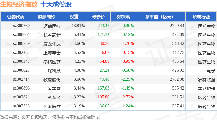 证券之星消息,10月20日,生物经济(970038)指数报收于2262.82点,涨0.08%,成交192.53亿元,换手率1.3%。当日该指数成份股中,上涨的有27家,我武生物以10.07%的涨幅领涨,下跌的有22家,亿帆医药以4.45%的跌幅领跌。