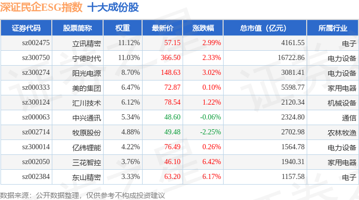证券之星消息,10月20日,深证民企ESG(970056)指数报收于1992.27点,涨1.35%,成交1048.88亿元,换手率2.17%。当日该指数成份股中,上涨的有31家,三花智控以6.42%的涨幅领涨,下跌的有18家,晶澳科技以2.5%的跌幅领跌。