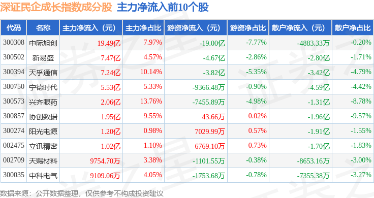 资金流向方面,深证民企成长(970071)指数成份股当日主力资金净流入合计23.89亿元,游资资金净流出合计25.01亿元,散户资金净流入合计1.12亿元。成份股资金流向详情见下表: