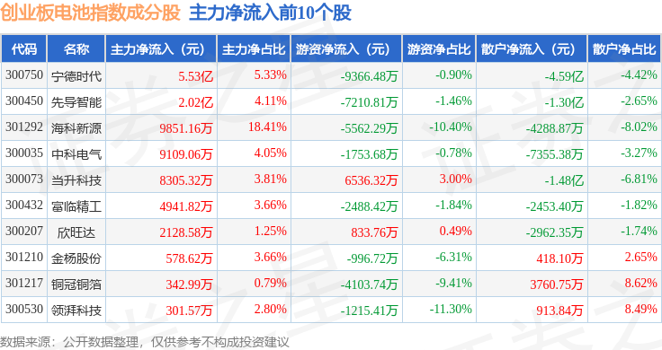 资金流向方面,创业板电池(970081)指数成份股当日主力资金净流出合计418.41万元,游资资金净流出合计3.99亿元,散户资金净流入合计4.03亿元。成份股资金流向详情见下表: