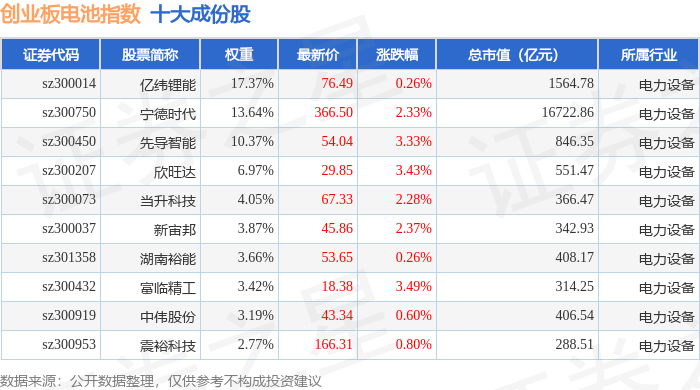创业板电池(970081)指数十大成份股详情如下: