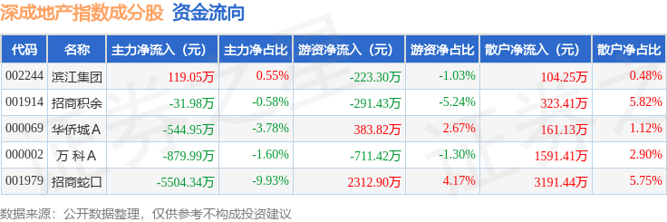 资金流向方面,深成地产(971001)指数成份股当日主力资金净流出合计6842.22万元,游资资金净流入合计1470.58万元,散户资金净流入合计5371.64万元。成份股资金流向详情见下表: