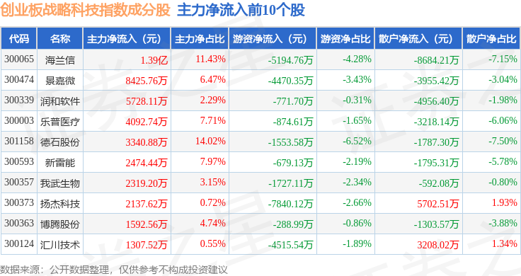 资金流向方面,创业板战略科技(971004)指数成份股当日主力资金净流出合计7.66亿元,游资资金净流出合计1.39亿元,散户资金净流入合计9.06亿元。成份股资金流向详情见下表: