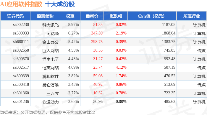 证券之星消息,10月20日,AI应用软件(980107)指数报收于1571.16点,涨0.86%,成交300.41亿元,换手率1.76%。当日该指数成份股中,上涨的有41家,恺英网络以4.12%的涨幅领涨,下跌的有7家,萤石网络以2.29%的跌幅领跌。