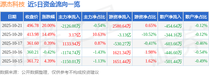证券之星消息,源杰科技10月21日涨停收盘,收盘价496.78元。该股于14点3分涨停,2次打开涨停,截止收盘封单资金为19.92万元,占其流通市值0.0%。