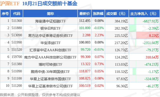 当日沪深ETF成交额前10大ETF基金中6只ETF基金收涨,平均涨幅0.53%,其中短融ETF(511360)以成交额384.19亿元排第一。从主力资金流入看,成交额前10大ETF基金中有2只ETF基金呈现主力资金净流入。