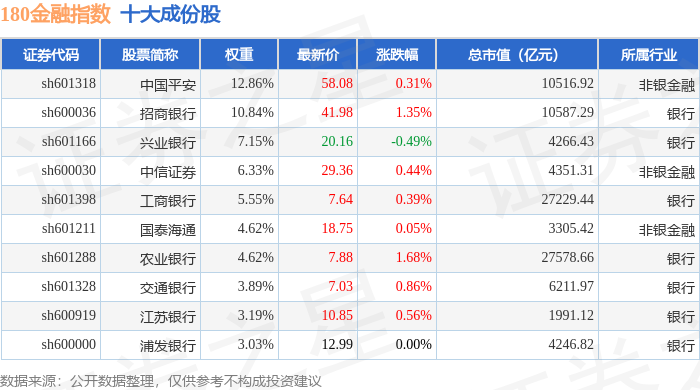 证券之星消息,10月21日,180金融(000018)指数报收于5771.09点,涨0.44%,成交639.76亿元,换手率0.37%。当日该指数成份股中,上涨的有27家,中国人寿以3.51%的涨幅领涨,下跌的有12家,渝农商行以1.12%的跌幅领跌。