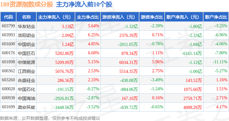 资金流向方面,180资源(000026)指数成份股当日主力资金净流出合计7.36亿元,游资资金净流入合计4.93亿元,散户资金净流入合计2.43亿元。成份股资金流向详情见下表: